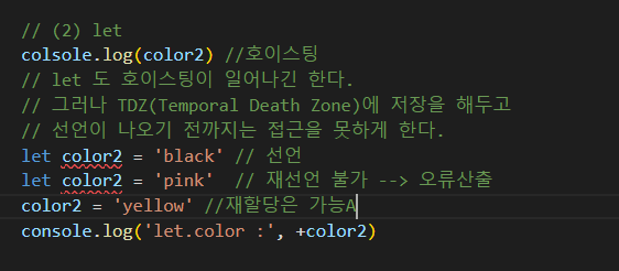 let 형식의 변수는 호이스팅이 일어나긴 하지만 TDZ(Temporal Death Zone)에 저장을 해두고