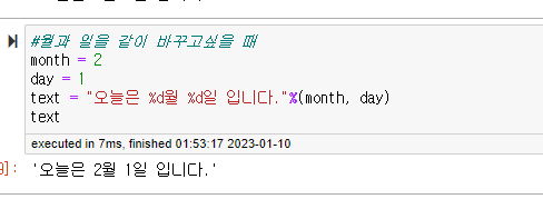 변수명 = ' 오늘은 1월 %d 일 입니다.' %바꾸고자하는 값이 입력된 변수명